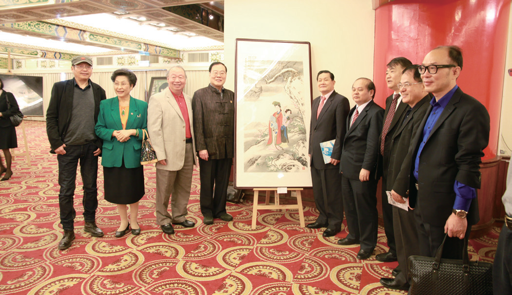 著名工笔画大师金大钧(左四)与前台北市议员陈俊源(右二)、台湾长擎实业集团董事长郑耀南(右三)等在他的作品前合影留念